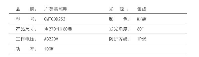 Beam angle | 120° | Operating temperature | -40-+70 | Size | Φ270*H160mm | ||