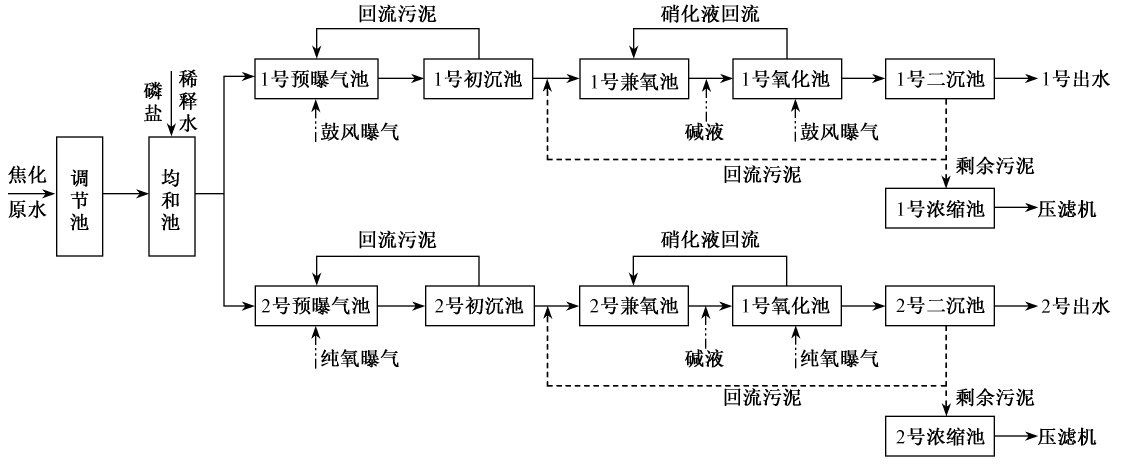衛(wèi)源曝氣生化系統(tǒng)包括均質(zhì)調(diào)節(jié)池、均質(zhì)池、反硝化池、硝化池,還包括污泥處理系統(tǒng)和輔助系統(tǒng)(其它系統(tǒng)的進料泵、儲藥系統(tǒng)、冷卻系統(tǒng)等未列入其它系統(tǒng)的單體設(shè)備)。