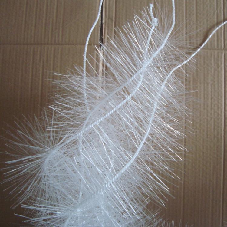 彈性填料篩選用聚烯烴類和聚酰胺中的幾種耐腐、耐溫、耐老化的品種,混合以親水、吸附、抗熱氧等助劑,采用特殊的拉絲、絲條制毛工藝,將絲條穿插同著在耐腐、高強(qiáng)度的中心繩上。由于選材和工藝配方精良,剛?cè)徇m度,使絲條呈立體均勻排列輻射狀態(tài),制成了懸掛式立體彈性填料的單體.填料在有效區(qū)域內(nèi)能立體全方位均勻舒展?jié)M布,使氣、水、生物膜得到充分混滲接觸交換,生物膜不僅能均勻地著床在每一根絲條上,保持良好的活性和空隙可變性,而且能在運(yùn)行過程中獲得大的比表面積。