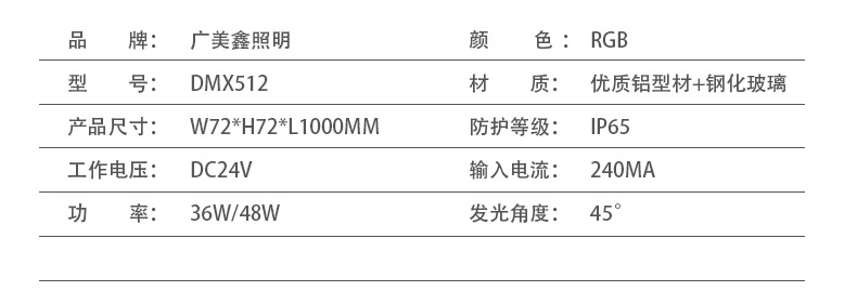 Life | 50000 | Protection level | IP65 | Scope of use | Bridges, building outlines, parks, plazas, KTV, discos, etc. |