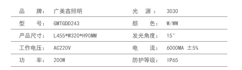 Size | L455*W320*H90mm | Life | 5000(H) | Protection level | IP65 |