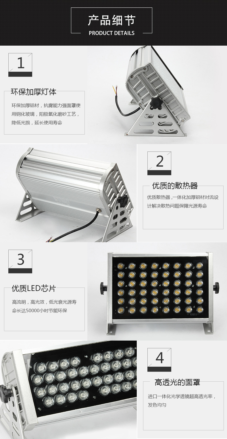 一、led大功率洗墻燈燈珠,led燈珠的質(zhì)量影響著led洗墻燈的散熱功用,比方一線品牌科銳與三線品牌三安的燈珠不只光效有許多不同,并且散熱功用也有不小的間隔。二、戶外led洗墻燈地址環(huán)境:洗墻燈外殼工作溫度降10度時(shí),洗墻燈燈具使用壽命降一半;led洗墻燈外殼工作溫度正常情況下是65度。三、戶外led洗墻燈外殼材料及厚度,鋁制材料要比體質(zhì)材料散熱功用要好的多,別的鋁制材料也分好多種,外
