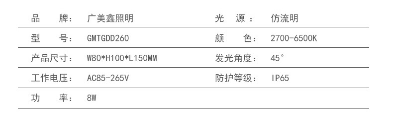 | 防護等級 | IP65 | 光源功率 | 8W | 電壓 | AC85-265V |